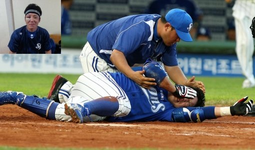 성 조동찬은 3일 사직 롯데전에서 고원준의 투구에 얼굴을 맞고 쓰러져 오른쪽 눈 밑을 40바늘이나 꿰맸다(큰 사진). 눈이 퉁퉁 부은 상태(작은사진)에서도 조동찬은 웃음을 잃지 않았다. 스포츠동아DB, 사진제공|스포츠코리아