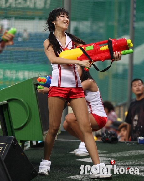 `2012 팔도 프로야구` KIA 타이거즈와 넥센 히어로즈의 경기가 7일 오후 광주 무등야구장에서 열렸다. 이닝 교체타임을 이용해 KIA 치어리더들이 관중들에게 시원을 물총을 뿌리고 있다.