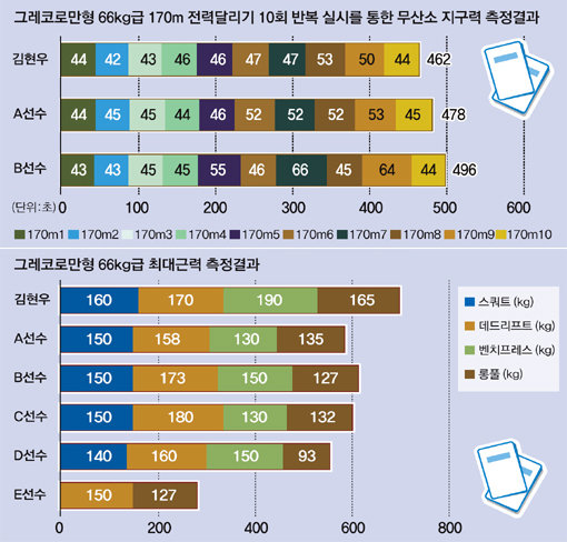 체육과학연구원(KISS) 정동식 박사는 “김현우(24·삼성생명)가 그레코로만형과 자유형을 통틀어 레슬링대표팀에서 가장 체력이 우수한 선수”라고 결론짓는다. KISS는 이미 런던올림픽 개막 전부터 김현우를 가장 유력한 레슬링 금메달 후보로 점찍었다. 올 2월과 5월 실시한 체력측정 결과 때문이다. 해외 논문들에 따르면, 엘리트 레슬링 선수와 일반 레슬링 선수 사이에는 최대근력이 7∼25% 정도 차이가 난다. 또 경기 중 지속적으로 강력한 파워를 발휘해야 상대를 제압할 수 있기 때문에 근지구력도 승패의 관건이 된다.