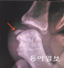 본보가 단독 입수한 김현우의 오른손 엄지손가락 X선 사진에 뼛조각이 떨어져 나간 흔적이 선명하다. 진단명은 중수골 내측 골절이다. 한국선수단 제공경기 날이 다가왔지만 손가락은 나아지지 않았다. 설상가상으로 ‘최악의 대진표’까지 받았다. 방대두 대표팀 총감독은 “대진 때문에 잠을 한숨도 못 잤다”며 한숨을 쉬었다.