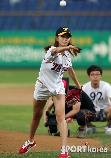 `2012 팔도 프로야구` KIA 타이거즈와 넥센 히어로즈의 경기가 9일 오후 광주 무등야구장에서 열렸다. 경기에 앞서 탤런트 김정민이 시구를 하고 있다.