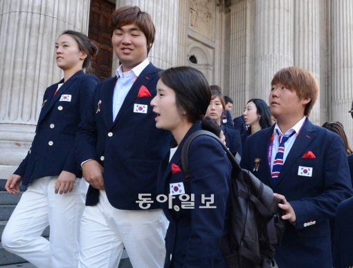 한국선수단 메달리스트들과 임원들이 런던시내 세인트 폴 대성당내에 있는 한국전 참전용사비 를 참배 헌화하고 참전용사들에게 감사의 인사를 했다. 연인관계인 양궁 기보배와 오진혁에게 보도진이 몰리자 어색해하고 있다.