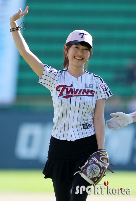 26일 오후 서울 잠실구장에서 열린 `2012 팔도 프로야구` LG 트윈스와 삼성 라이온즈의 경기에서 KBS 엄지인 아나운서가 시구를 한 뒤 손을 들어 인사를 하고 있다.