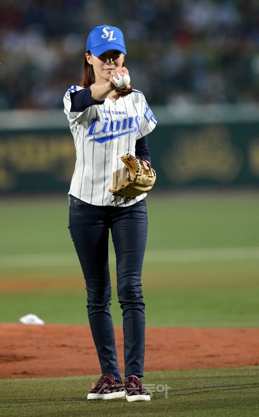 25일 대구 시민야구장에서 열린 2012 프로야구 한국시리즈 2차전 삼성라이온즈 대 SK와이번스 경기 전 탤런트 윤세아가 시구를 하고 있다.