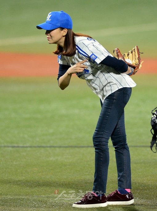 25일 저녁 대구 시민야구장에서 열린 2012 프로야구 삼성과 SK의 한국시리즈 2차전 경기에서 탤런트 윤세아가 시구를 하고 있다.