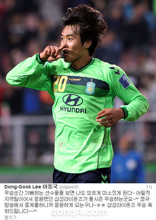 이동국은 1일 자신의 트위터에 "우승 순간 기뻐하는 선수들을 보면 나도 모르게 미소짓게 된다. 어릴 적 지역팀이어서 응원했던 삼성 라이온즈가 올시즌 우승하는군요. 정규방송에서 중계를 하니까 응원하게 되는구나. 삼성라이온즈 우승 축하드립니다"라는 글을 남겼다.