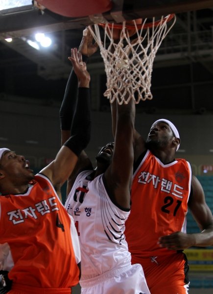 ‘2012~2013 KB 국민카드 프로농구’ 인천 전자랜드 엘리펀츠와 부산KT의 경기가 1일 오후 인천 삼산체육관에서 열렸다. 3쿼터 KT 존슨이 전자랜드 가스토와 문태종의 밀착수비를 따돌리고 슛을 쏘고 있다. 사진제공|KBL