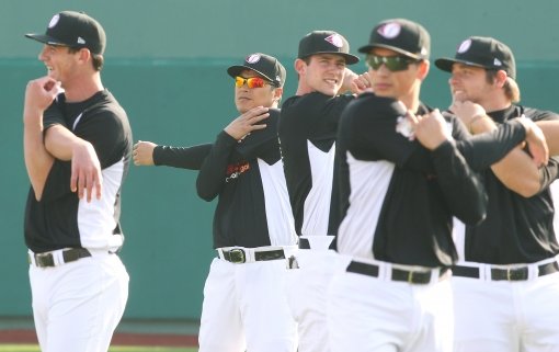 호주리그에서 2년 연속 세이브왕에 오른 구대성(왼쪽 2번째)이 7일 사직구장에서 호주 대표 퍼스 히트 선수들과 함께 몸을 풀며 2012아시아시리즈를 준비하고 있다. 사진제공|스포츠코리아
