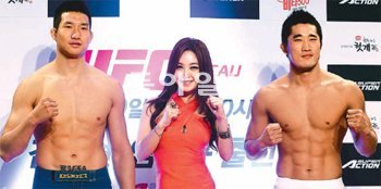 김동현(오른쪽)과 임현규가 2일 서울 용산 아이파크몰에서 열린 포토타임에서 옥타곤걸 강예빈과 포즈를 취했다. 한국인 최초의 UFC 파이터인 김동현과 UFC 데뷔전을 앞둔 임현규는 10일 중국 마카오 대회에 함께 나갈 예정이었지만 임현규가 체중 감량을 하다 실신해 아쉽게 동반 출격이 무산됐다. 동아일보DB