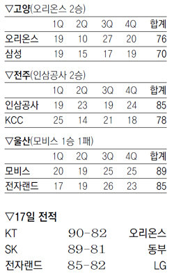 모비스는 전자랜드를 89-85로 꺾고 5연승의 상승세를 이어갔다. 11승(4패)째를 거둔 모비스는 SK와 공동 선두가 됐다. 모비스 문태영은 29득점, 9리바운드로 공격과 수비에서 맹활약해 22득점, 3리바운드에 그친 형 문태종(전자랜드)과의 맞대결에서 판정승을 거뒀다. KCC를 85-78로 꺾고 4연승을 달린 인삼공사는 10승(5패) 고지에 올라 전자랜드와 함께 공동 3위가 됐다.