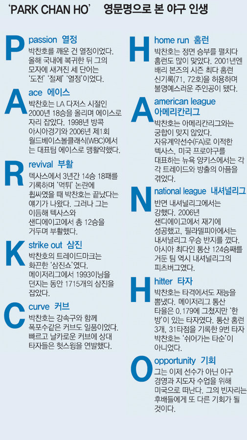 이날 메이저리그 공식 홈페이지(mlb.com)도 아시아 출신 최다승(124승) 투수인 박찬호의 은퇴 소식을 비중 있게 전했다. ‘코리안 특급’은 이제 또 다른 도전을 시작한다.