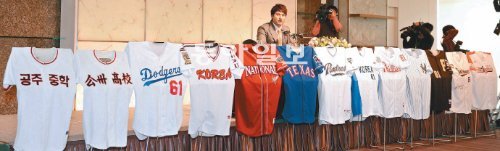 그는 유니폼 한 장 한 장의 의미를 일일이 설명하며 추억을 되새겼다. 기자회견 내내 담담하던 박찬호도 추억이 깃든 유니폼 앞에선 감정이 북받쳤다. 가장 오래 입고 뛰었던 다저스의 유니폼(9시즌)을 보고는 잠시 눈시울이 붉어졌다. 그는 텍사스 유니폼을 두고 “저와 가족에게 경제적으로 큰 도움을 줬지만 ‘먹튀’라는 별명을 붙여줬다”며 재치 있는 설명으로 팬들의 환호와 비난이 함께했던 시간을 되돌아봤다.