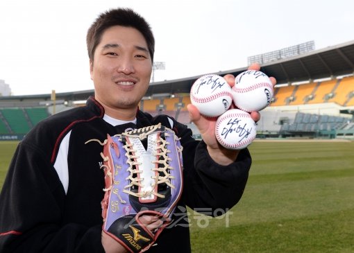인터뷰를 마친 그가 팬들에게 선물할 친필 사인볼을 들고 웃고 있다. 잠실|김종원 기자 won@donga.com