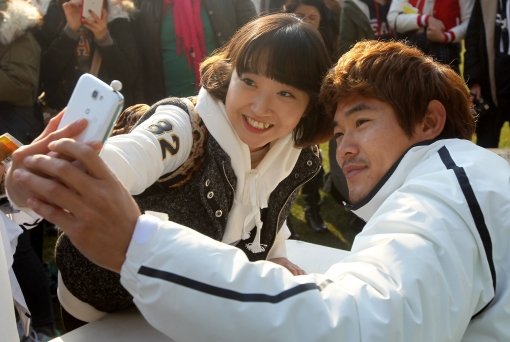 성적이 상승하자, 팬들 반응도 달라졌다. 올 시즌 두산 에이스 역할을 한 노경은(오른쪽)이 2일 잠실구장에서 열린 ‘곰들의 모임’에서 한 여성팬과 다정하게 기념 사진을 찍고 있다. 사진제공|스포츠코리아