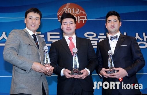 넥센 박병호가 7일 서울 임피리얼팰리스호텔에서 열린 ‘2012 프로야구 올해의 상’(스포츠서울 제정·스포츠토토 후원) 시상식에서 올해의 선수에 뽑혀 상금 2000만원과 트로피를 받았다. 이승엽과 장원삼(이상 삼성)은 각각 올해의 타자·투수상을 받아 상금 500만원과 트로피를 챙겼다.