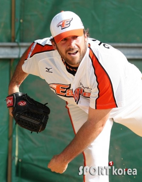 26일 일본 오키나와 고친다 구장에서 진행된 한화 이글스 2013 오키나와 전지훈련에서 한화 새 용병 이브랜드가 투구연습을 하고 있다. (오키나와=스포츠코리아)