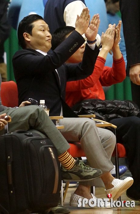 19일 저녁 부산사직실내체육관에서 열린 `2013 KB 국민카드 프로농구‘ 부산 KT 소닉붐과 전주 KCC 이지스의 경기에서 가수 싸이가 경기를 관람하며 박수를 치고 있다.
