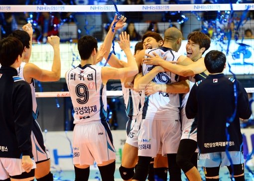 삼성화재 선수들이 24일 열린 V리그 남자부 챔피언결정전 1차전에서 대한항공을 누른 뒤 다같이 기뻐하고 있다. 대전|박화용 기자 inphoto@donga.com 트위터@seven7sola