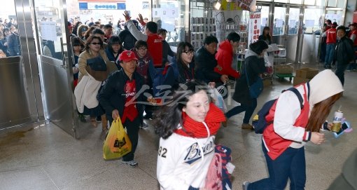 이제 시범경기도 새벽같이 줄을 서서 봐야 한다. 두산-LG전이 열린 24일 잠실구장. 출입문이 개방되자마자 미리 기다리고 있던 수많은 팬들이 좋은 자리를 차지하기 위해 한꺼번에 바삐 달려가고 있다. 잠실|김종원 기자