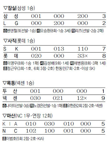 이날도 공격의 포문을 연 것은 하위 타선이었다. 0-0이던 2회말 2사 1루에서 7번 타자 김민성의 좌익수 옆 2루타로 선취점을 뽑았고, 곧바로 유한준이 노경은을 상대로 2점 홈런을 쏘아 올렸다. 김민성은 3타수 3안타 1타점, 유한준은 2타수 1안타 3타점을 기록했다. 이날은 침묵했지만 이성열은 홈런 1위(6개)를 달리고 있다. 지난해와 같은 실패는 없을 것이라는 게 현재 넥센 선수단의 분위기다. 한편 잠실 경기에서는 삼성이 LG에 3-2로 역전승했고, 롯데는 SK를 8-7로 꺾었다.