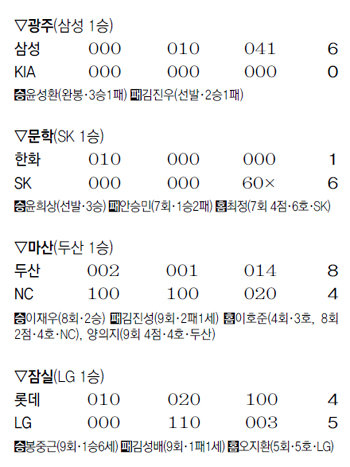 두산은 마산에서 옛 스승 김경문 감독이 이끄는 NC를 8-4로 꺾었다. LG는 9회말 2사 1, 3루에서 터진 이진영의 끝내기 좌중월 2루타로 잠실에서 롯데를 5-4로 꺾고 2연패에서 벗어났다.