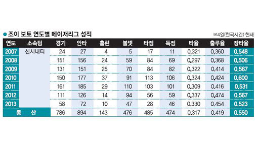 신시내티 레즈의 간판스타 조이 보토(30)는 예외다. 보토는 지난해 4월 10년간 2억2500만달러의 조건으로 계약연장에