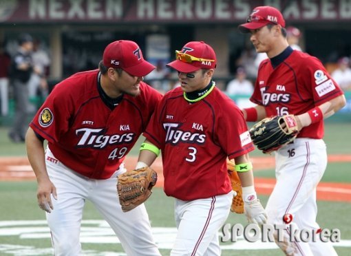9일 오후 서울 목동구장에서 열린 ‘2013 한국야쿠르트 세븐 프로야구’ 넥센 히어로즈와 KIA 타이거즈의 경기에서 KIA 선발투수 김진우가 6회말 넥센의 공격을 막아낸 뒤 덕아웃으로 향하며 김선빈을 격려하고 있다. 김진우는 올 시즌 9경기에서 4승 4패와 방어율 3.81을 기록하고 있다.