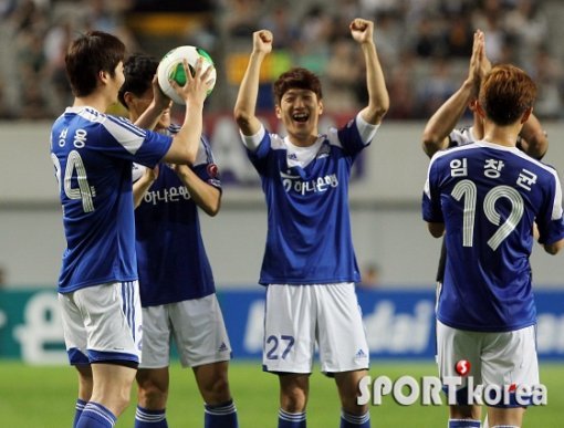 21일 오후 서울 상암월드컵경기장에서 열린 ‘2013 하나은행 K리그 올스타전’에서 첼린지 팀 구자철이 후반 동점골을 터뜨린 후 기성용에게 부케공 세리머니를 한 뒤 선수들이 함께 환호하고 있다.