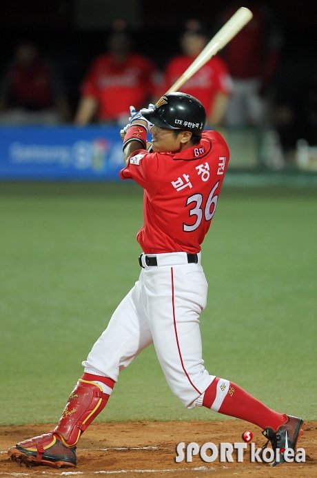 10일 오후 대구 시민야구장에서 열린 ‘2013 한국 야쿠르트 세븐 프로야구’ 삼성 라이온즈와 SK 와이번스의 경기 7회초 1사 상황에서 SK 박정권이 솔로 홈런을 때리고 있다.