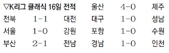 울산은 2골을 넣은 김신욱의 활약을 앞세워 제주에 4-0으로 완승을 거뒀다. 승점 37이 된 울산은 2위 포항에 1점 앞선 선두를 유지했다. K리그 클래식은 20∼28일 국내에서 열리는 동아시안컵 때문에 30일까지 2주간의 휴식기에 들어간다. 동아시안컵 기간에는 21일 제주-인천 한 경기만 열린다.