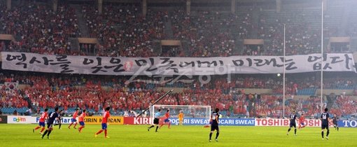 붉은악마는 28일 한일전을 앞두고 대형 걸개를 준비했다. 임진왜란 때 왜구를 물리친 이순신 장군과 이토 히로부미를 저격한 안중근 의사를 새겼다. 나머지는 ‘역사를 잊은 민족에게 미래는 없다’는 단재 신채호 선생의 격언을 적었다. 글귀는 일제 식민치하에서 한민족의 의식을 계몽하기 위한 일침이었다. 그러나 이날은 달랐다. 역사 논란에서 비켜서지 말라는 자극적 의미를 담고 있었다. 일본에 질 수 없다는 팬들의 강렬한 메시지였다.
