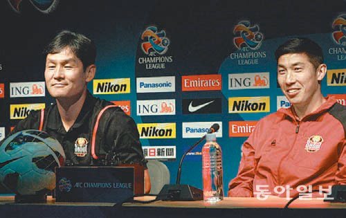 최용수 FC 서울 감독(왼쪽)과 차두리가 24일 서울월드컵경기장에서 아시아축구연맹(AFC) 챔피언스리그 4강 1차전을 하루 앞두고 열린 기자회견에서 웃으며 기자들의 질문을 듣고 있다. FC 서울 제공