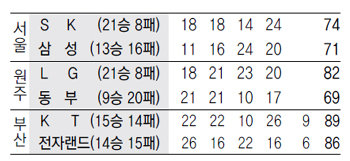 원주에선 LG가 동부를 82-69로 꺾고 4연승했다. LG 문태종이 3점슛 4개를 성공시키며 20점을 올렸다. 동부는 간판스타 김주성이 2쿼터 막판 LG 데이본 제퍼슨의 발을 밟아 왼쪽 발목이 돌아가는 부상까지 입는 불운에 시달렸다.