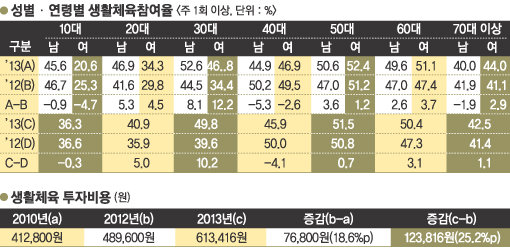 2010년 통계청 인구조사에 의하면 10세 이상 우리나라 국민은 4337만7014명이다. 이를 이번 조사결과에 반영하면 규칙적인 생활체육 참여자는 2012년 1873만명에서 2013년 1973만명으로 약 100만명이 증가한 것으로 볼 수 있다. 성별로는 여성 참여율이 2012년 40%에서 2013년 43.3%로 3.3%P 증가해 46.6%(2012)에서 47.8%(2013)로 1.2%P 늘어난 남성보다 증가폭이 컸다.