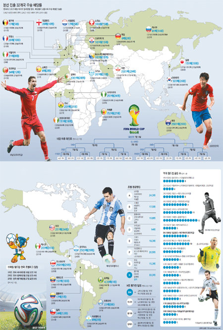 바늘구멍을 지날 만큼 적은 이란, 호주 등도 기적 창조에 도전한다. 유럽의 선봉장 크리스티아누 호날두(포르투갈)와 남미의 최고사령관 리오넬 메시(아르헨티나)는 빠르면 8강에서 격돌할 수 있다. 홍명보 감독이 지휘하는 한국은 32개 참전국 중 국제축구연맹(FIFA) 랭킹(61위)이 가장 떨어지지만