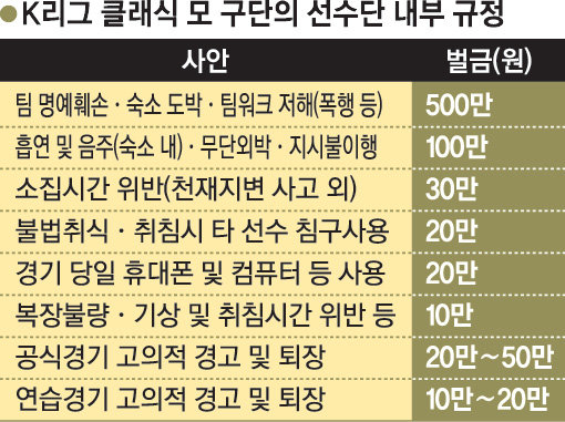 지각은 물론 부상 은폐 경우까지 상세 명시 다툼이나 분위기 저해하면 최고 1000만원 음주운전 등 대외적 물의는 구단 차원 징계 쌓인 벌금은 상조회비나 연말 회식비로 써