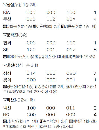 잠실에서는 두산이 선발 유희관(28)의 7이닝 1실점 호투를 발판으로 KIA를 4-1로 꺾고 3연패에서 탈출했다. 삼성 역시 울산에서 롯데에 7-1로 승리하며 3연패를 끊었다. SK는 문학에서 한화를 8-1로 꺾고 4연승으로 선두 자리에 올랐다.