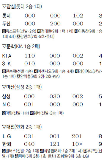 문학에선 KIA가 SK를 4-1로 꺾었다. KIA 선발 한승혁은 데뷔 후 2번째 선발 등판에서 6과 3분의 2이닝을 1실점으로 틀어막고 첫 승을 올렸다. 국내 프로무대에 첫선을 보인 삼성 외국인 투수 마틴도 7이닝 1실점으로 데뷔승을 거뒀다. 삼성은 1번 타자로 변신한 나바로가 5타수 4안타 3타점으로 맹타를 휘둘러 팀의 5-1 승리를 이끌었다.