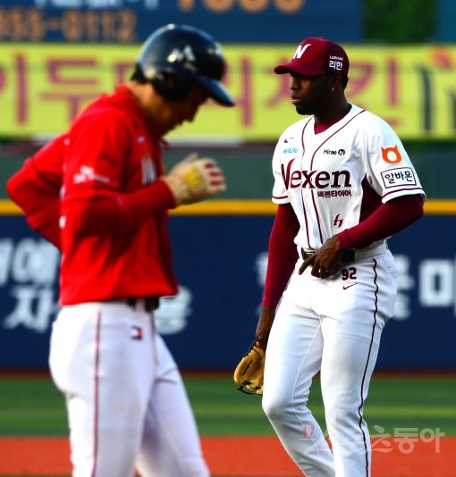 29일 저녁 서울 목동야구장에서 열린 프로야구 넥센과 SK의 경기에서 넥센 선발 투수 소사가 1회초 SK 타자 박계현의 2타점을 포함 한 4실점을 허용 한 후 이닝을 마치고 그라운드를 내려오고 있다.