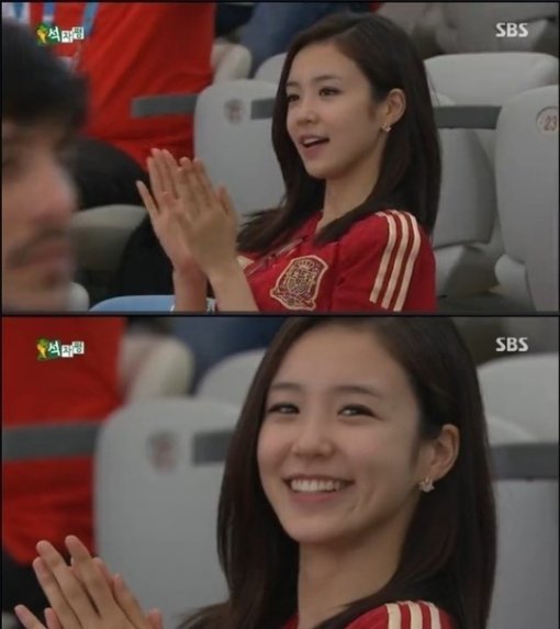 이날 장예원 아나운서의 얼굴이 후반 시작 전 중계카메라에 포착됐다. 이에 장 아나운서는 스페인 유니폼 입은 채 카메라를 쳐다보며 환하게 웃었다.