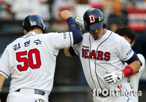 4일 서울 잠실구장에서 열린 ‘2014프로야구’ 두산 베어스와 삼성 라이온즈의 경기에서 두산 4번 칸투가 1회말 1사 1루에서 중월 투런홈런을 치고 홈인하며 김현수와 세레모니를 펼치고 있다.