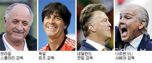 월드컵에서 우승하려면 자국 감독에게 사령탑을 맡기라는 말이 있다. 역대 단 한 번도 외국인 감독이 우승컵을 들어올린 적이 없었기 때문이다. 20회째인 이번 브라질 월드컵에서도 4강에 오른 팀 사령탑이 모두 자국 출신이 됨에 따라 ‘자국 감독 우승의 역사’는 계속 이어지게 됐다. 개최국 브라질의 루이스 펠리피 스콜라리 감독과 독일의 요아힘 뢰프 감독, 아르헨티나의 알레한드로 사베야 감독, 네달란드의 루이스 판할 감독이 자국팀을 4강으로 이끌었다.
