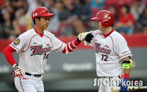 12일 광주-기아 챔피언스필드에서 열린 ‘2014프로야구’ KIA 타이거즈와 NC 다이노스의 경기에서 KIA 7번 김다원이 2회말 선두타자로 나와 비거리 120미터 좌월 솔로 홈런을 치고 홈인하며 차일목과 하이파이브를 나누고 있다.