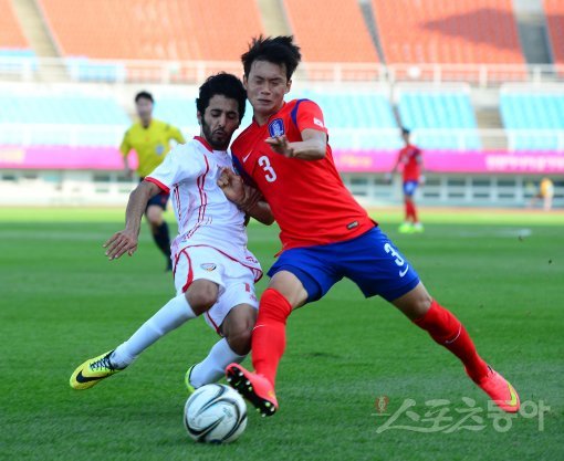10일 안산 와스타디움에서 열린 인천아시안게임 한국 축구대표팀과 UAE 축구대표팀과의 연습경기에서 한국 김진수가 UAE 수비수와 볼다툼을 벌이고 있다.