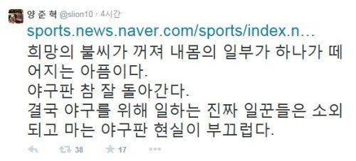 양준혁은 11일 자신의 트위터를 통해 “희망의 불씨가 꺼져 내 몸의 일부하나가 떼어지는 아픔이다. 야구판 참 잘 돌아간다. 결국 야구를 위해 일하는 진짜 일꾼들은 소외되고 마는 야구판 현실이 부끄럽다”면서 고양원더스 해체에 일침 했다.