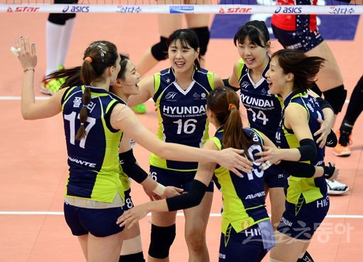 현대건설 선수들이 22일 수원체육관에서 열린 2014∼2015 V리그 KGC인삼공사와의 경기에서 득점에 성공한 뒤 기뻐하고 있다. 현대건설은 세트스코어 3-0으로 승리하며 선두에 복귀했다. 수원|김종원 기자 won@donga.com 트위터 @beanjjun