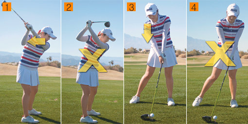 “다운스윙 때는 오른쪽 어깨를 왼쪽 어깨의 아래쪽으로 회전한다고 생각하면 된다. 클럽을 크게 휘두를 수 있고, 인사이드-아웃의 스윙 궤도를 만들어 좀더 빠른 스윙 속도를 이끌어낼 수 있다.”