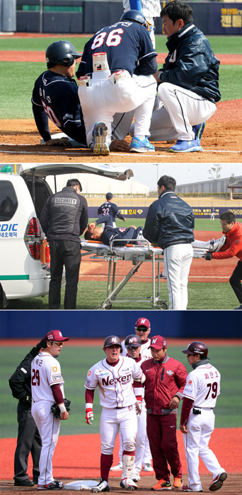 이뿐만 아니다. 목동구장의 넥센과 kt도 나란히 주축선수들 때문에 가슴을 쓸어 내렸다. 넥센은 주전포수 박동원이 2회 2사 후 안타를 친 뒤 2루로 슬라이딩을 하다 오른쪽 발목에 통증을 느껴 교체됐다. 다행히 아이싱으로 응급처치를 한 뒤 부기가 가라앉았다. 5회에는 kt 용병 3루수 앤디 마르테가 경기에서 빠졌다. 넥센 박헌도의 타구가 바운드된 뒤 예상보다 높게 튀어 오르면서 마르테의 이마를 강타한 것이다. 개막 준비에 한창인 소속팀들에게는 눈앞이 아득해질 만한 장면이었다.