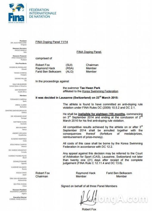 FINA는 23일(현지시간) 공식 홈페이지를 통해 “2014년 9월 3일 실시된 박태환에 대한 약물 검사결과 세계반도핑기구 금지약물이자 남성 호르몬인 테스토스테론 성분이 검출됐다”며 “FINA규정에 의해 18개월간의 선수 자격정지 징계를 결정했다”고 발표했다.