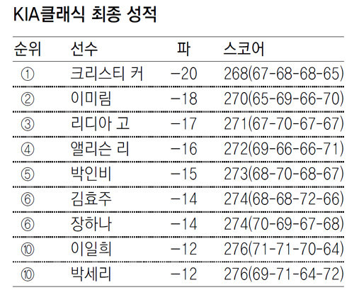 이로써 올 시즌 개막 후 이어진 한국(계) 선수의 우승행진은 6연승(지난 시즌 포함 10연승)에서 멈췄다. 우승은 38세의 크리스티 커(미국)에게 돌아갔다. 이미림에게 3타 뒤진 채 마지막 라운드를 출발한 커는 이날에만 7타를 줄이며 정상에 올라 미국 선수로는 시즌 첫 챔피언이 됐다. 2013년 대리모를 통해 아들을 얻은 커는 2년 만에 통산 17승째를 거둔 뒤 눈물을 쏟았다. 엄마가 된 뒤 첫 트로피를 안은 감격과 지난주 부친상을 당한 전담 캐디 그레그 존스턴의 아버지에 대한 추모의 표시였다.